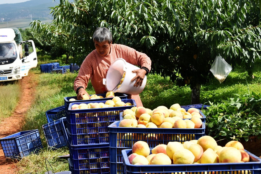 金秋时节,宣威市热水镇关营村横当地水果种植基地数百亩桃子已进入成熟季。成排的桃树枝繁叶茂,饱满的桃子挂满枝头,诱人的果香四处弥漫。工人们穿梭在桃林中,有条不紊地忙着采摘、分拣、运送,一派丰收忙碌的景象。