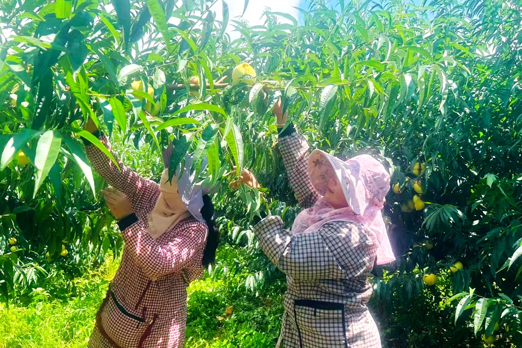 基地除了种植250余亩桃子外,还种植苹果50亩、梨70亩、李子30亩,水果产业的不断发展为当地群众提供了更多就业机会,让大家实现了既能照顾家庭又能赚钱的愿望,合作社常年用工8人,采摘期用工量增至20多人,每年支付工人工资超30万元。