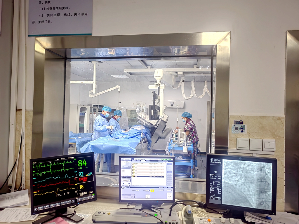 尽管患者的心跳和呼吸已暂时恢复,但引发本次险情的根本原因——冠状动脉急性闭塞,必须立即处理!每一秒都关乎心肌的存续,每一刻都牵系生命的延续。心血管内科介入团队早已严阵以待,在心血管内科主任代荣俗的充分沟通下,家属愿意尽一切力量放手一搏,在ICU医护人员全程监护与保障下,患者被迅速转运至导管室。冠脉造影迅速明确病因:回旋支中段完全闭塞!心血管内科介入团队凭借成熟的实战经验和精湛的技术操作,迅速通过导丝、球囊扩张、病变位置精准植入一枚支架,成功开通闭塞段血管,实现血流瞬间恢复。整台手术高效流畅,圆满成功!