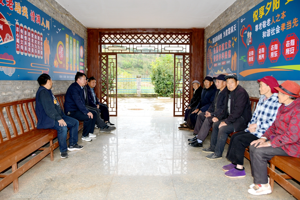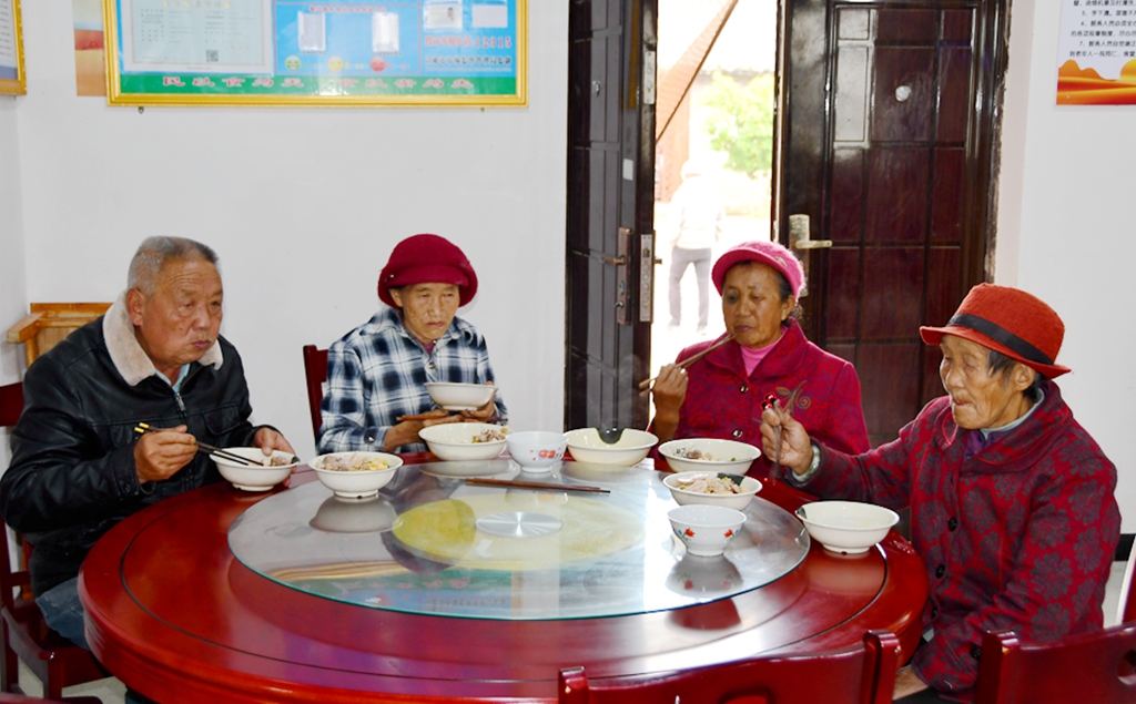 在羊场镇茨营村居家互助养老活动中心,刚出锅的炖排骨、西红柿炒蛋、小炒肉等5道菜香气诱人,老人们排队打菜,围坐在一起开心吃饭,脸上洋溢着幸福的笑容。