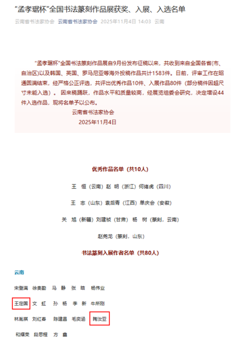 由云南省书法家协会、昭通市文学艺术界联合会主办,云南文学艺术馆、昭通市书法家协会、凤池书院承办的“孟孝琚杯”全国书法篆刻作品展,自9月份发布征稿以来,共收到来自全国各省(市、自治区)以及韩国、英国、罗马尼亚等海外投稿作品共计1583件。经严格公正评选,共评出优秀作品10件、入展作品80件,入选作品44件。宣威市作者王定国《孟孝琚碑记》、陶汝亚《孟孝琚碑赋》2件作品入展。