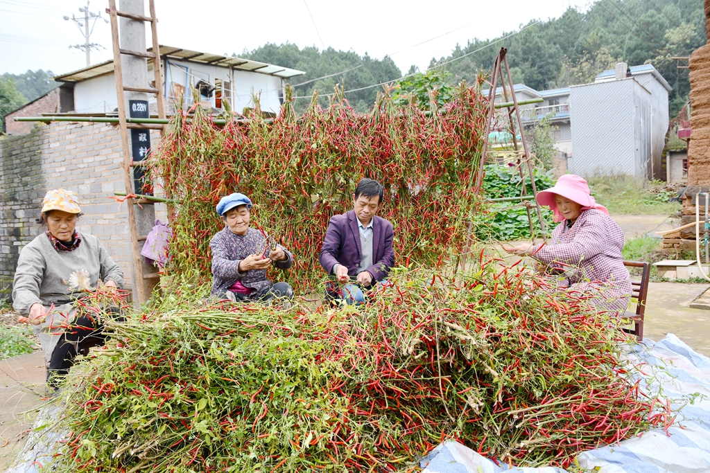 在龙潭镇业肥村,村民丁成标在院子里晾晒、采摘辣椒。丁成标2019年开始种植辣椒,种植面积从最初的2亩多发展到现在的10亩。这些辣椒晾干后,将卖给当地的辣椒种植专业合作社。