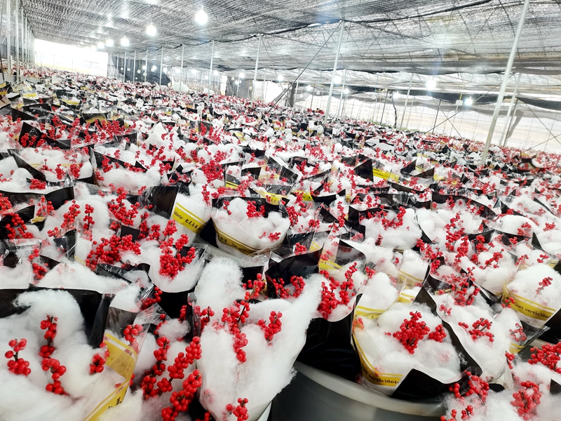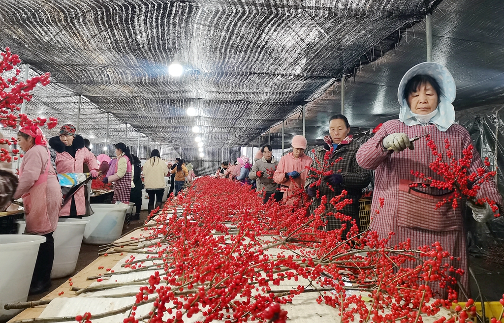 一入冬,热水镇的千亩北美冬青种植基地便进入了采收季。鲜花分拣区,数十名工人成排站在操作台前,抖叶、剪枝、分级包装,这些刚刚从地里收割来的北美冬青,被精心整理成一束束漂亮的花束等待发货。它们将通过冷链物流发往全国各地。从2021年首次上市至今,这里的北美冬青年发货量从最初的50万枝增加到200万枝,产值实现翻番。