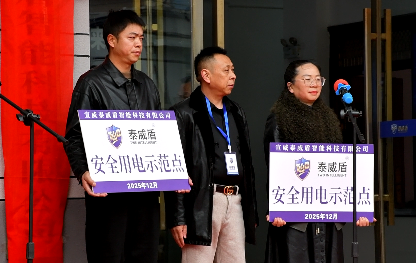 在宣威泰威盾智能科技有限公司揭牌仪式上,企业代表进行了致辞,随后进行了捐赠仪式。据悉,该公司在宣威市退役军人事务局和虹桥街道马房社区设置了“智慧安全用电示范点”,成为宣威市首批“智慧安全用电示范单位”。最后,大家参观了室内“智慧安全用电沉浸式体验区”,观看了浸水保护、生物识别保护等防漏电功能的现场演示。