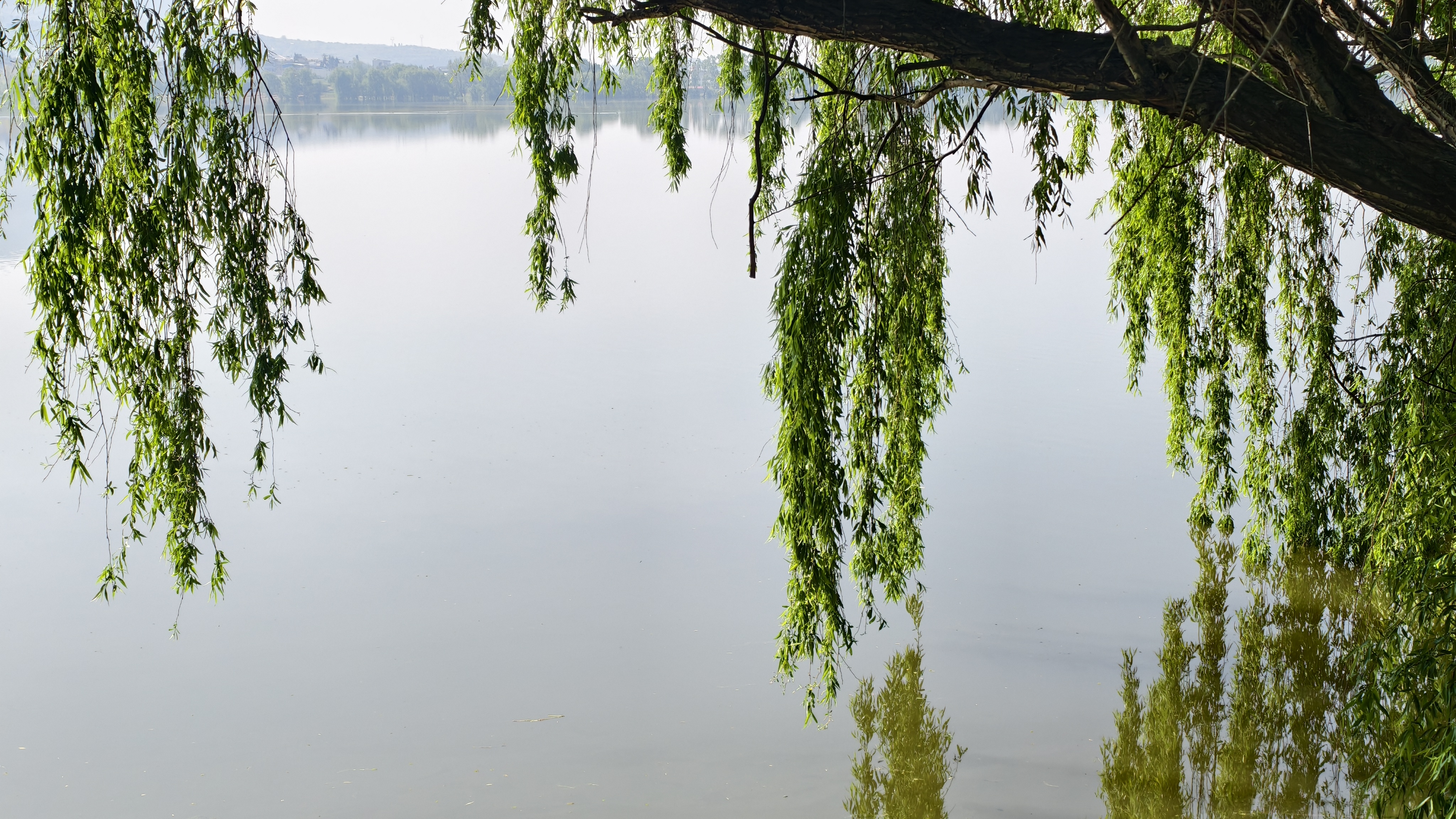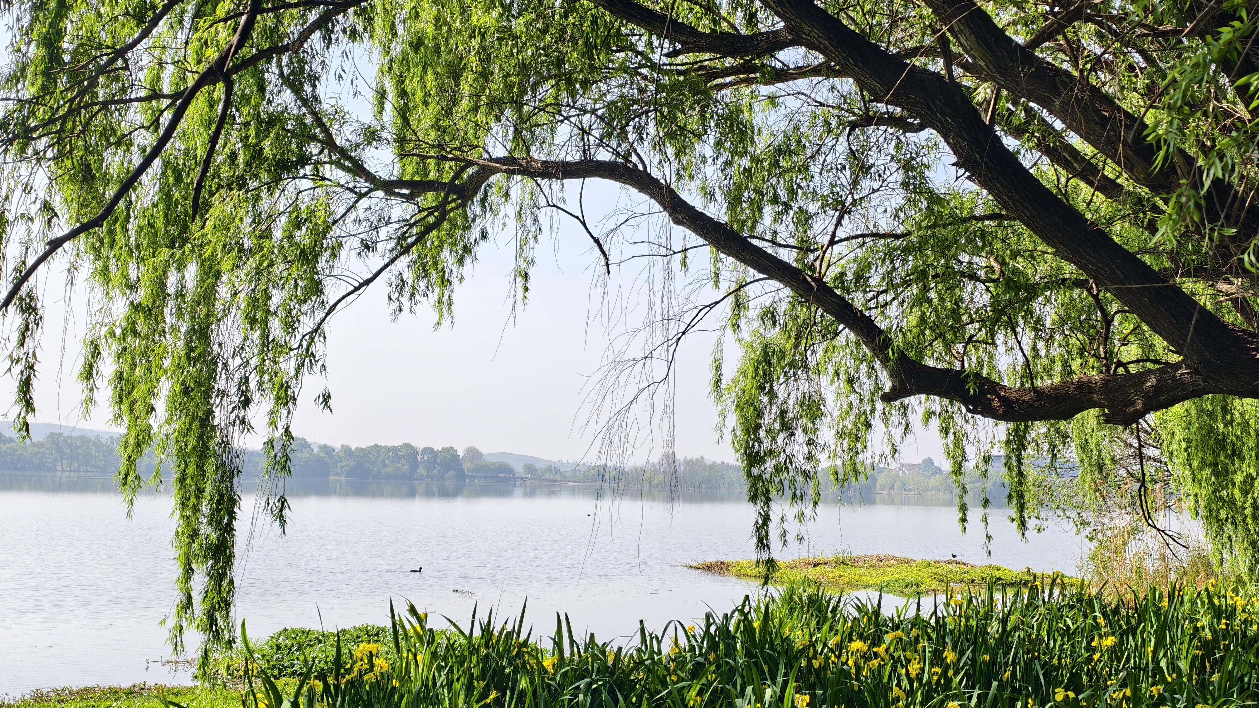 远处的山峦起伏如黛,薄雾轻笼峰腰,似一幅未干的水墨长卷;突出新芽的柳树最为柔美,嫩绿初绽,风过处摇曳生姿,仿佛时光也放慢了脚步,不忍惊扰这一抹鲜亮的春意。湖面偶有渔船缓缓划过,桨声欸乃,搅碎云影天光;水中的野鸭,时而潜入清波,时而浮出水面,翅尖抖落晶莹水珠,在阳光下划出细碎虹彩;几只幼鸭排成一列,在低垂的柳条间蹒跚学步,绒毛沾着水汽,在暖阳里泛着柔光……这稚拙的步履,何尝不是春天最本真的笔触?